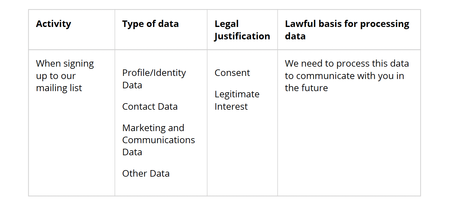 We will only use your Personal Data when the law allows us to. Set out below is a table containing the different types of Personal Data we collect and the lawful basis for processing that data. Please refer to section 2.2 for more information on the lawful basis listed in the table below.